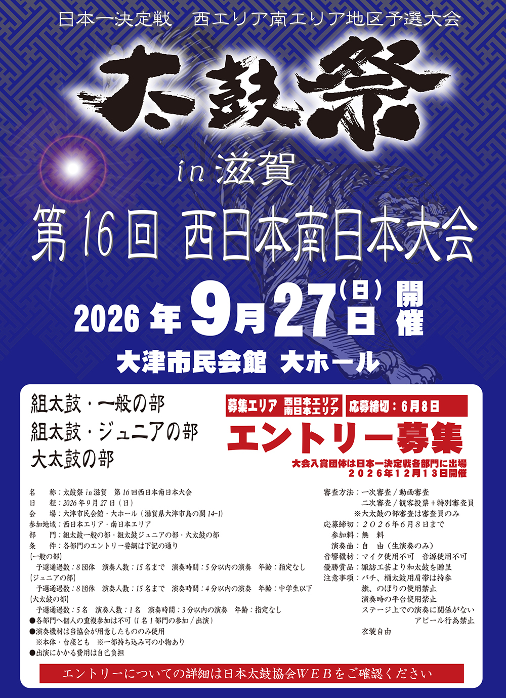 大会名: 太鼓祭in滋賀 第16回西日本・南日本大会開催日: 2026年9月27日