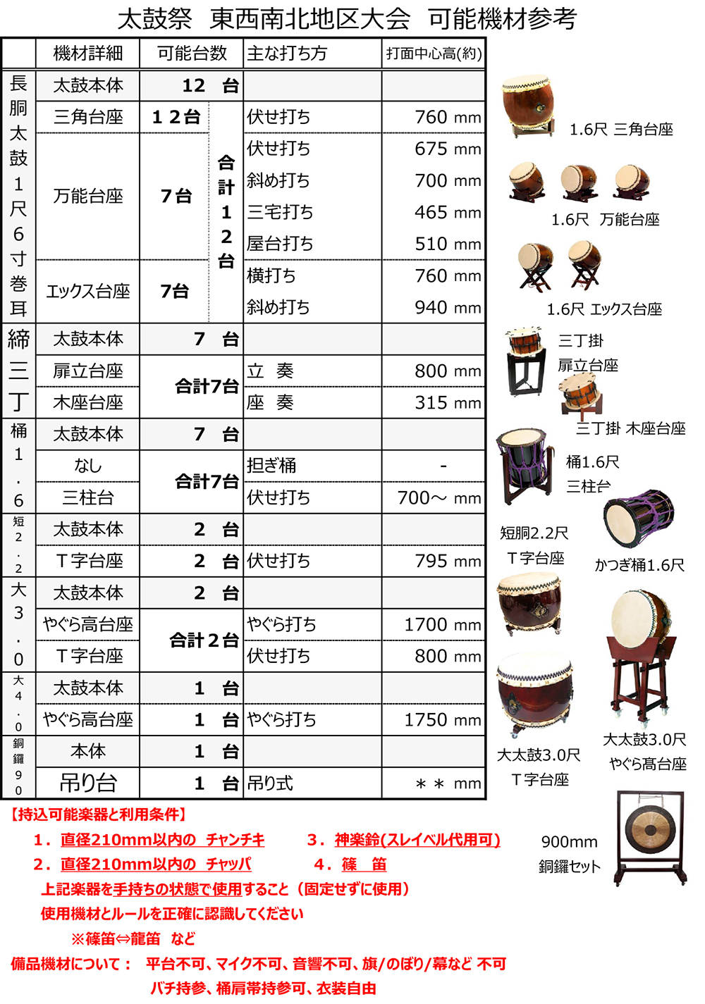 【西日本・南日本大会 参加要項】▲使用太鼓機材はレンタル品のみ使用 ※太鼓機材の持ち込み不可