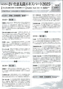 出場 | ※出演順表記※ 【組太鼓ジュニアの部 5団体】 1.伊奈町綾瀬太鼓 夢童 2.横浜市立南中学校和太鼓部 3.駒込中学和太鼓部「疾風」 4.和太鼓「志響」 5.創作演舞団「FUTAMI」 【組太鼓一般の部 5団体】 1.彩鼓奏 2.城西大学付属川越高校 和太鼓欅 3.花咲徳栄高校伝統芸能部 4.鼓龍會 5.群馬県立安中総合学園高校 飛翔 【特別ゲスト】 ・すわんどGOLDEN TIMES ・和太鼓合同演奏 |