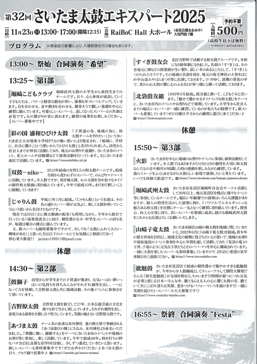 合同演奏:「希望」 堀崎こどもクラブ 彩の国 浦和ひびけ太鼓 双鼓~niko~ じゃりん鼓 鼓獅子 吉野原太鼓 あずま太鼓 すゞき鼓友会 北袋鼓友組 火影 堀崎武州太鼓 山崎子竜太鼓 批魅鼓 祭終 合同演奏:「Festa」 |