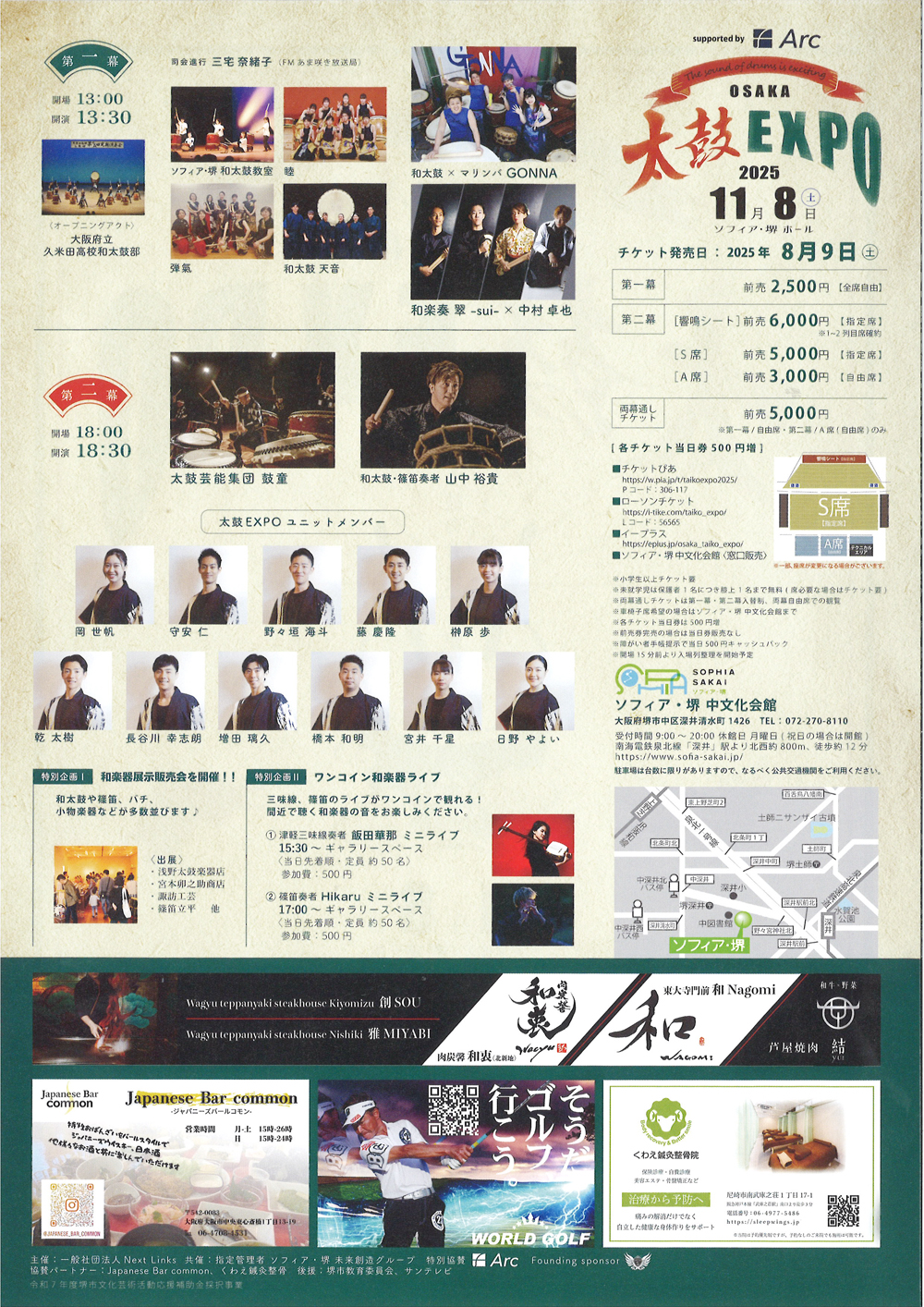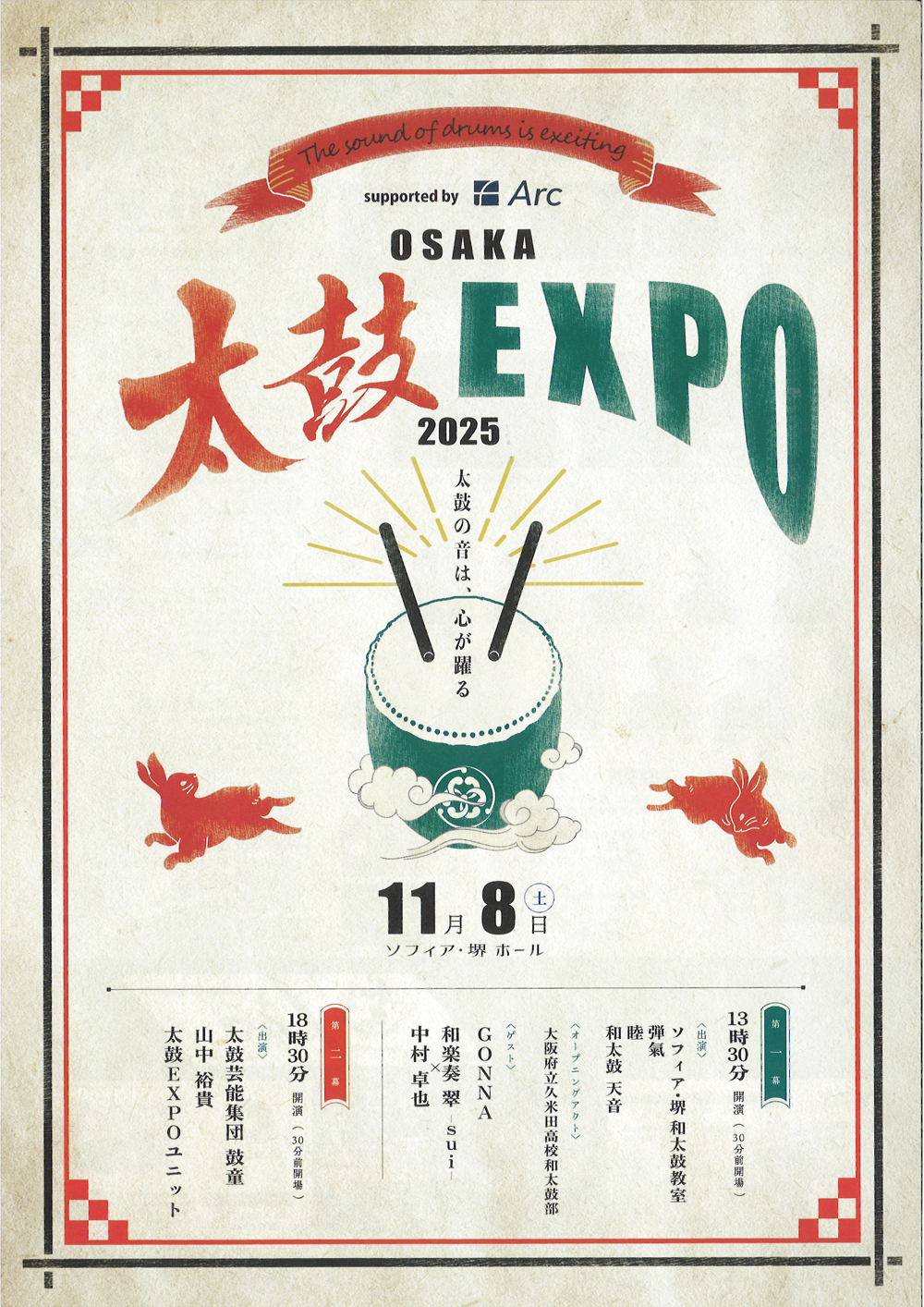 出演 | 【第一幕】 ●オープニングアクト 大阪府立久米田高校和太鼓部 ・ソフィア堺 和太鼓教室 ・弾氣 ・睦 ・和太鼓 天音 ●ゲスト ・GONNA ・和太鼓翠-SUI-×中村卓也 【第二幕】 太鼓芸能集団 鼓童 山中 裕貴 太鼓EXPOユニット |