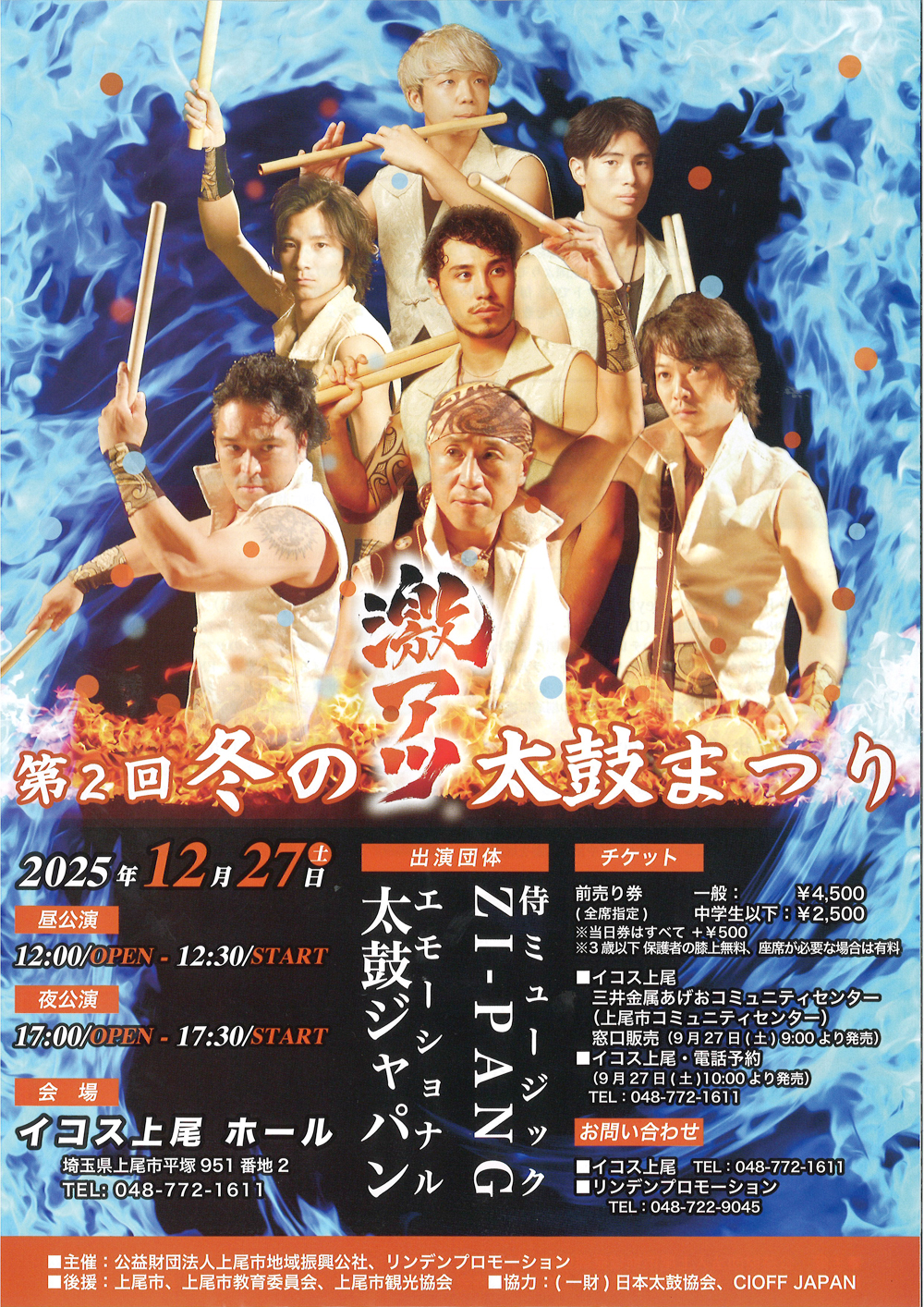 チケット | 10月18日販売開始 予定 ・チケットぴあ /10:00~ WEB窓口のみ ※要アカウント ・日本太鼓協会事務局 電話窓口 10:00~受付開始 048-543-1677 WEB窓口 10:00~公開 |