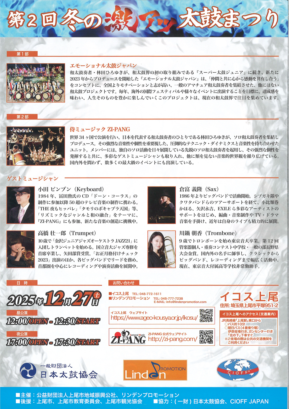 出演 | 侍ミュージック ZI-PANG エモーショナル太鼓ジャパン 【ゲストミュージシャン】 小田 ビンブン(キーボード) 倉富 義隆(サックス) 高橋 壮一郎(トランペット) 川鍋 朝香(トロンボーン) |